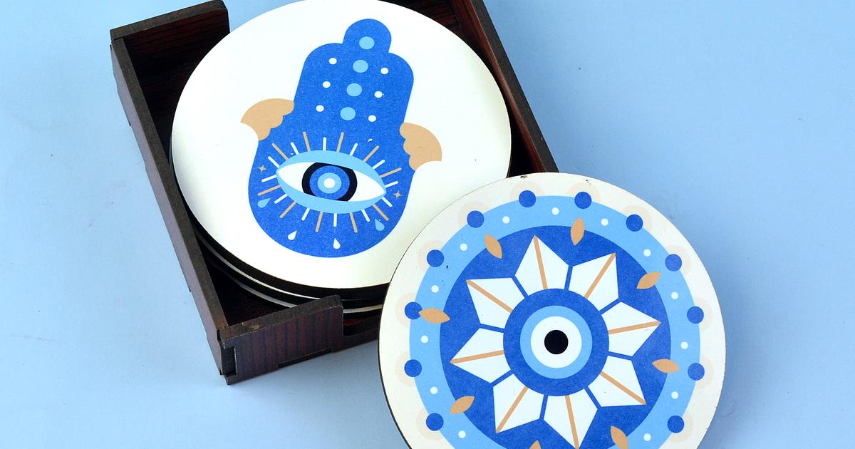 These are cool evil eye-themed coasters that can be a nice gift for your loved ones whom you want to protect from the negative energy. These are assorted but maintain the blue and white theme.Specifications:Evil Eye Coasters (Set of 6)